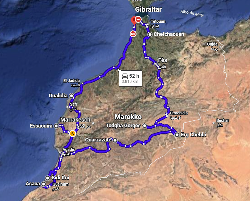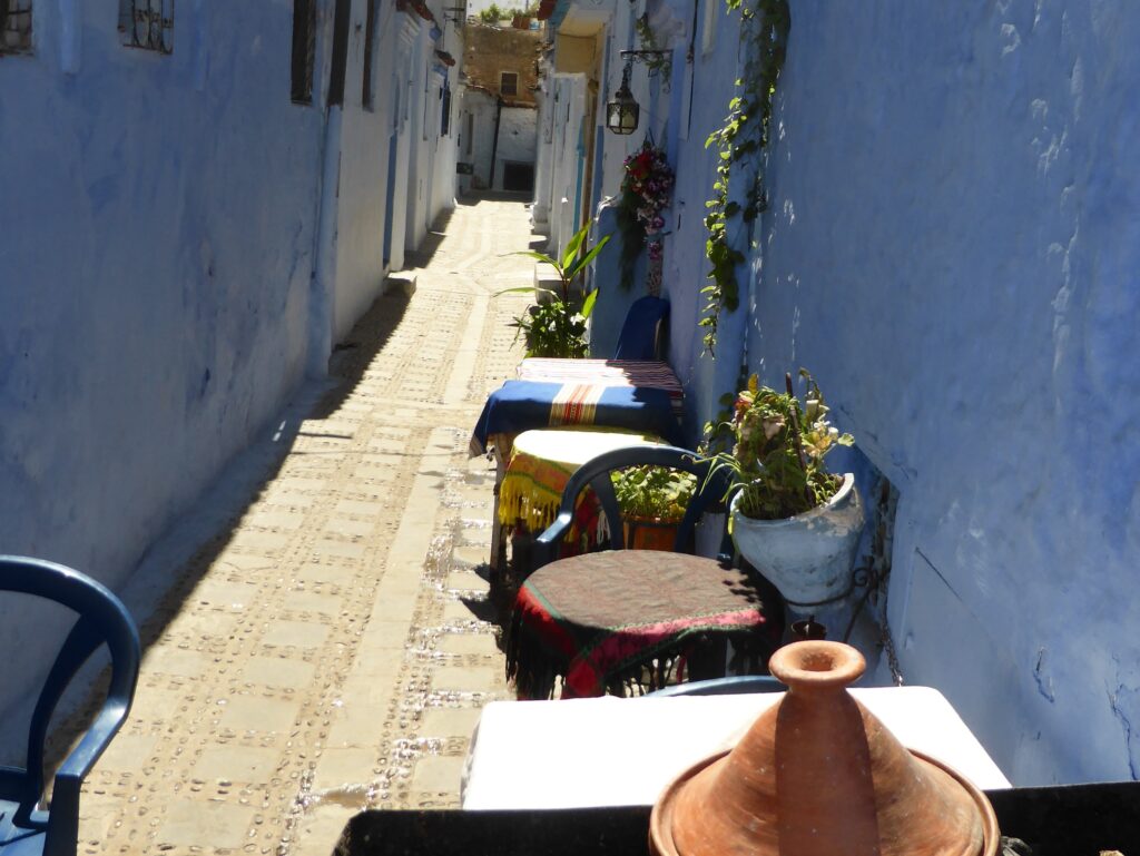Angekommen in Tanger, nach einer angenehmen kurzen Überfahrt durch die Straße von Gibraltar und Delfinbeobachtungen, startete das Abenteuer Marokko. Erstes Ziel war die blaue Stadt Chefchaouen. Ja, der Kern der Stadt war wirklich blau, auch die Unterkunft. Die Wirkung auf mich war friedlich und mit einem nostalgisch. Ich erkundete die verwinkelten Straßen, klopfte mal eine der verschlossenen Türen und genoss meine erste Tajine. Eine im Tontopf gegarte traditionelle Speise, die es in allen Varianten zu bestellen gab. Lecker!