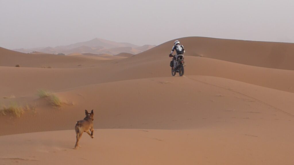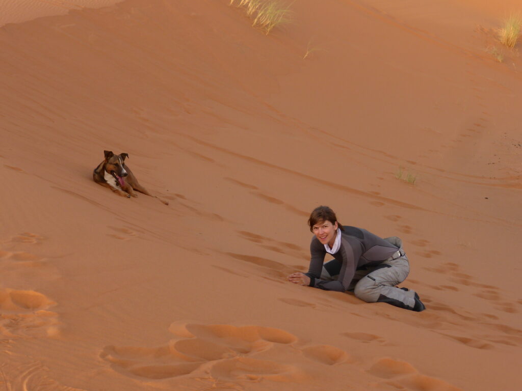 Landschaftlich umso beeindruckter verlief die Fahrt reibungslos und nach ein paar Tagen, kam ich in Merzouga an. Die Wüstenlandschaft Erg Chebbi als auch die Temperaturen um die 45 Grad hauten mich im wahrsten Sinne um. Ich kämpfte anfänglich mit unerträglichen Kopfschmerzen und hatte Schwierigkeiten mich an dieses Klima anzupassen. Regen fiel hier laut unsres netten Kashbah- Inhabers, der sogar Deutsch sprach- nur zweimal im Jahr. Kleiner Spoiler, wir erwischten beide Tage 😉 inklusive Sandsturm. Ausfahrten in die Dünen bei Sonnenaufgang und – untergang bescherten eine meiner schönsten Momente. Die Farben, der Duft und die Stille verzauberten mich und ließen nicht nur mein Herz höher schlagen. Auch ein zutraulicher Hund, ich taufte ihn Grapfel, von Granatapfel, da ihm das Schwanzende fehlte , kürzte ich kurzerhand seinen Namen, rannte frei und glücklich dem Motorrad hinterher und legte sich später ausgepowert neben mich in den Sand. Wir hatten ein paar Stunden ausgelassenen Spaß. Ich hätte ihn so gern mit nach Deutschland genommen. Jedoch war kein Platz mehr auf dem Motorrad.